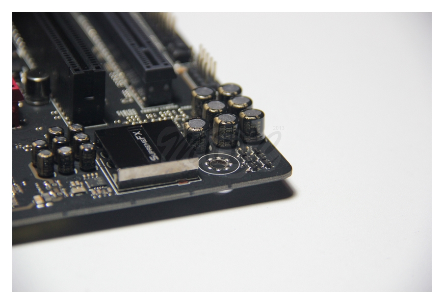 The audio isolation strip has a BIOS togglable red LED strip. Note that the SupremeFX audio section is equipped with premium Japanese-made ELNA caps. The Asus Sonic Soundstage button is seen here too.
